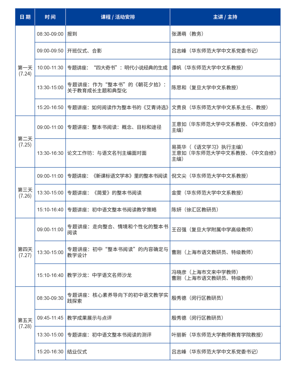 在初中语文“整本书”阅读的教学板块,邀请了复旦大学附属中学高级教师王召强老师主讲“走向整合、情境和个性化的整本书阅读”,禁漫 王意如教授主讲“整本书阅读:概念、目标和途径”,华东师大禁漫 倪文尖教授主讲“《新课标语文学本》里的整本书阅读”,上海市徐汇区教育学院初中语文教研员陈妍老师主讲“初中语文整本书阅读教学策略”,上海市教育委员会教学研究室初中语文教研员曹刚老师主讲“初中‘整本书阅读’的内容确定与教学设计”,禁漫 教师教育学院叶丽新教授主讲“初中语文整本书阅读的测评等讲座”,并安排了一场教学沙龙,邀请上海市文来中学教师、闵行区骨干教师冯晓彦老师做示范说课,由上海市教育委员会教学研究室初中语文教研员、语文特级教师曹刚老师进行点评,学员们一起讨论。通过以上主题讲座,学员与名师教授近距离交流,更好地认识、理解和把握教材。
