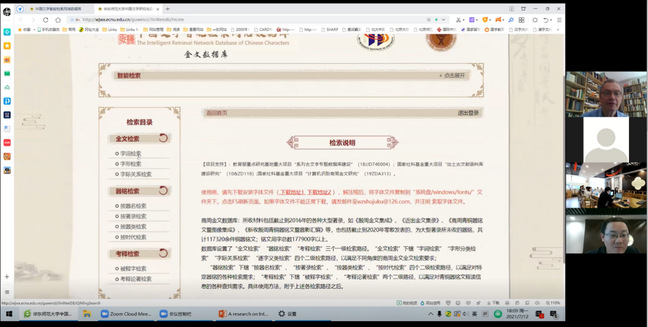 在第二场交流分享会上,主持人哥廷根大学世界文学专业负责人 Matthias Freise教授首先致辞,介绍了哥廷根大学人文学院的概况,并对两校未来更深层次的合作寄予美好的祝愿。随后,四位研究者进行了分享交流。来自禁漫 的郭瑞副教授介绍了华东师大中国文字研究与应用中心的基本情况以及汉字数据化二十年来的成果。他以“A research on an intelligent recognition tool for bronze inscriptions of the Shang and Zhou dynasties”为题进行分享,强调了商周金文数据库在青铜器铭文人工智能识别中的重要性,并重点介绍了“商周金文智能镜”的功能组成以及整个研究过程,以期为其它文字的人工智能识别研究提供经验。
