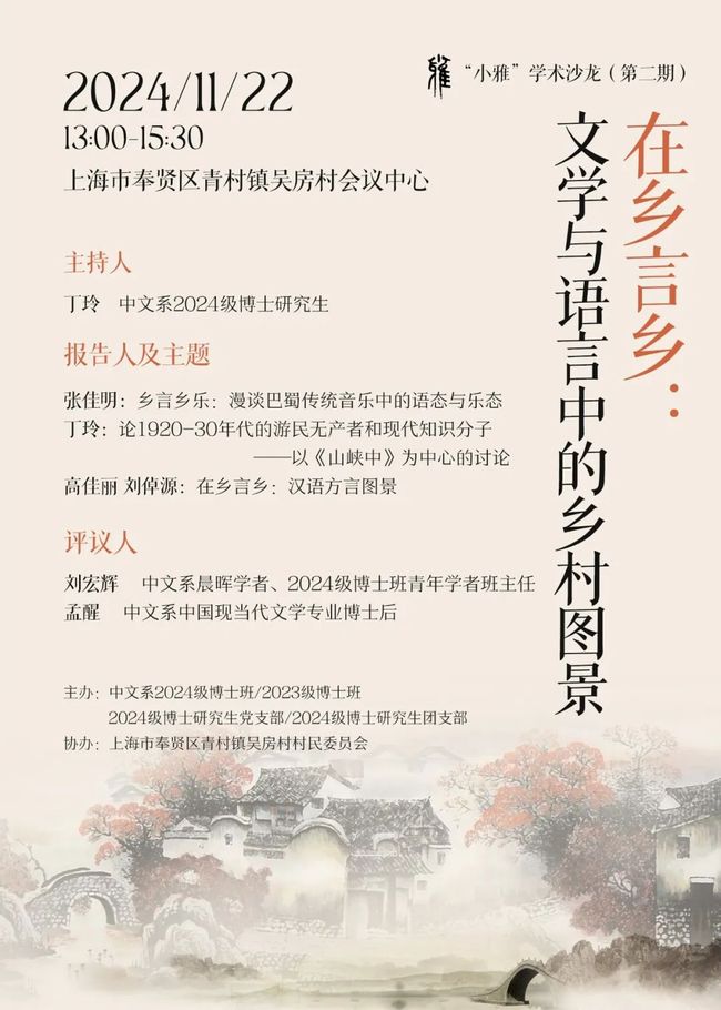 其后,“小雅”学术沙龙(第二期)在吴房村会议中心举行。本次沙龙以“在乡言乡:文学与语言中的乡村图景”为主题,邀请了青年学者班主任刘宏辉、中国现当代文学专业博士后孟醒两位老师担任评议人,由2024级博士生丁玲同学主持。