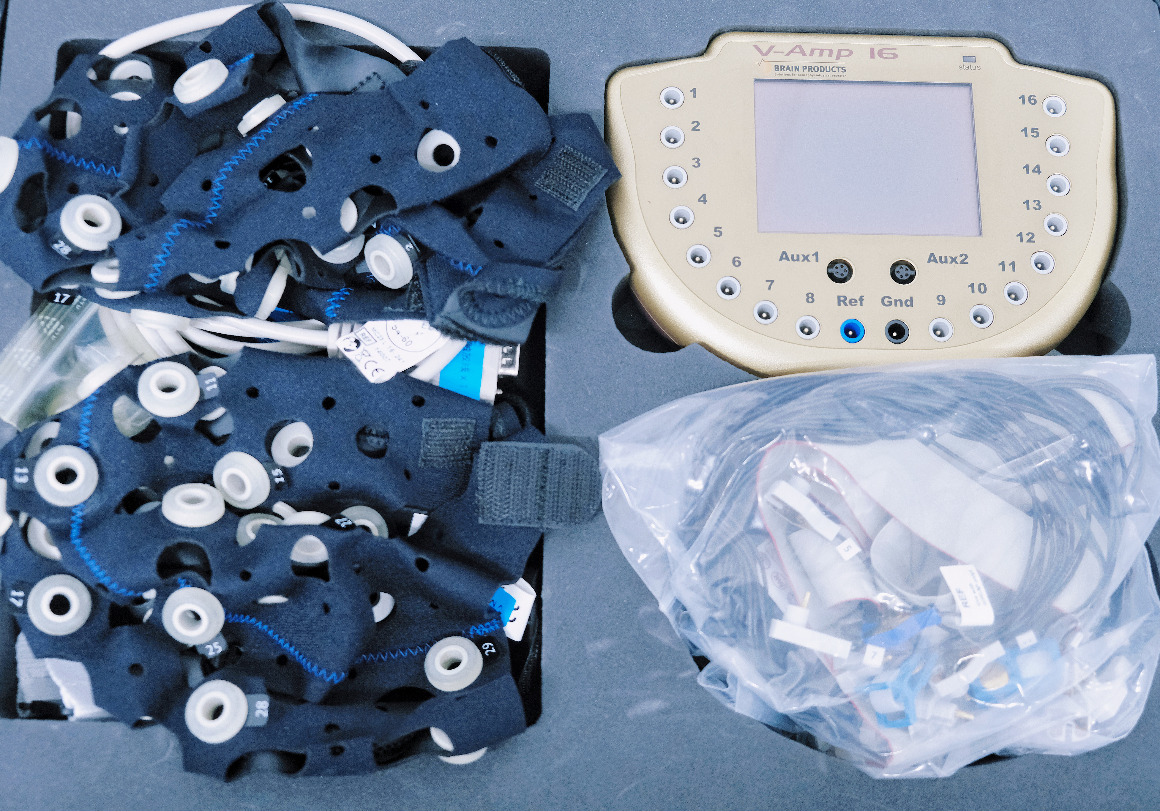 另外,实验室还拥有德国Brain Products公司开发的V-Amp型脑电采集系统,该系统配合干电极脑电帽使用。相较于广泛应用的与湿电极脑电帽相关的系统,该系统具有相对简易且便携的优点,可灵活应用于田野调查等多种场景。