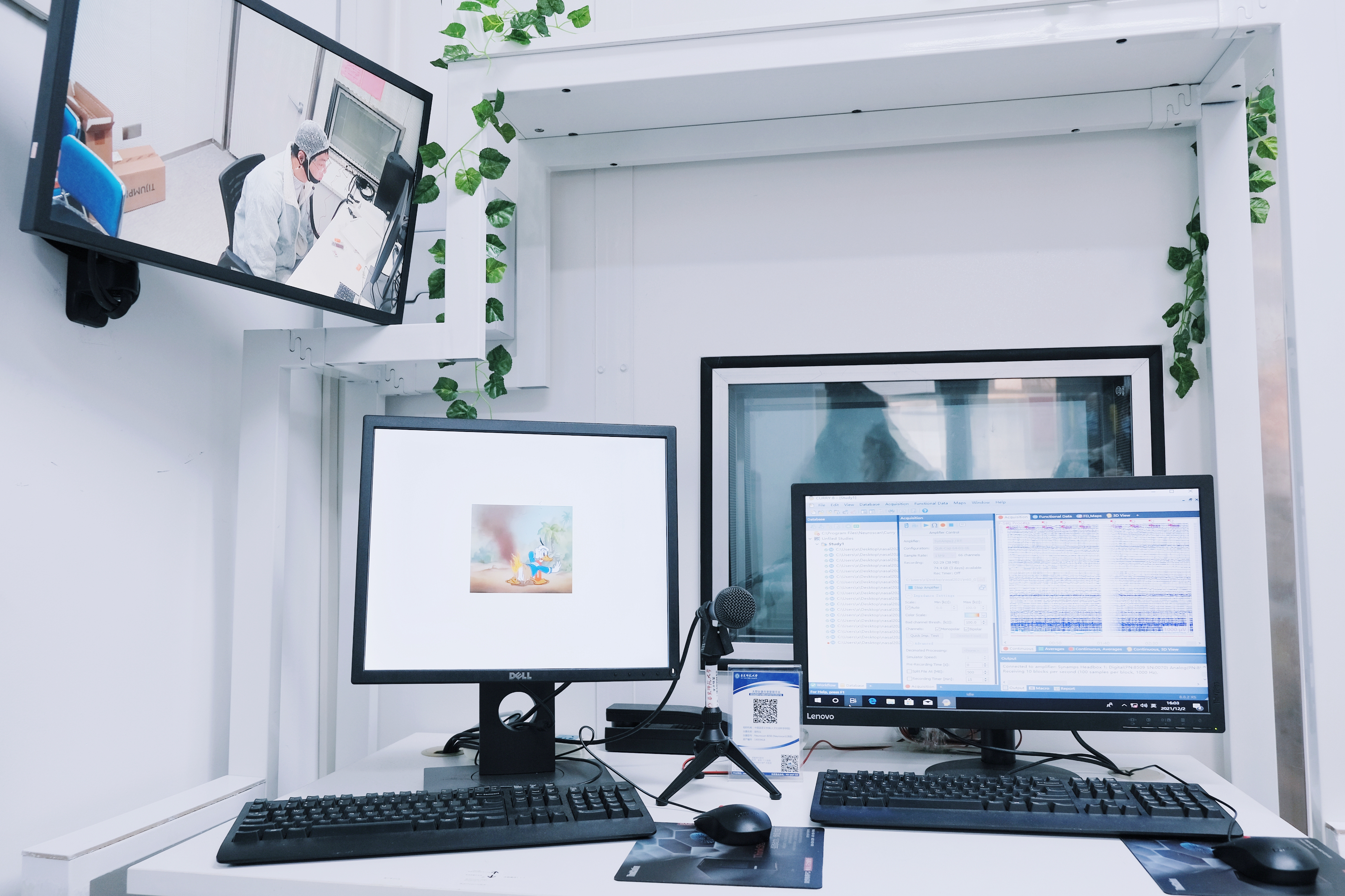 脑电实验室配备电磁屏蔽隔声室,容纳三套主体脑电设备,同时配备了两台工作站,以配合不同的脑电系统工作。