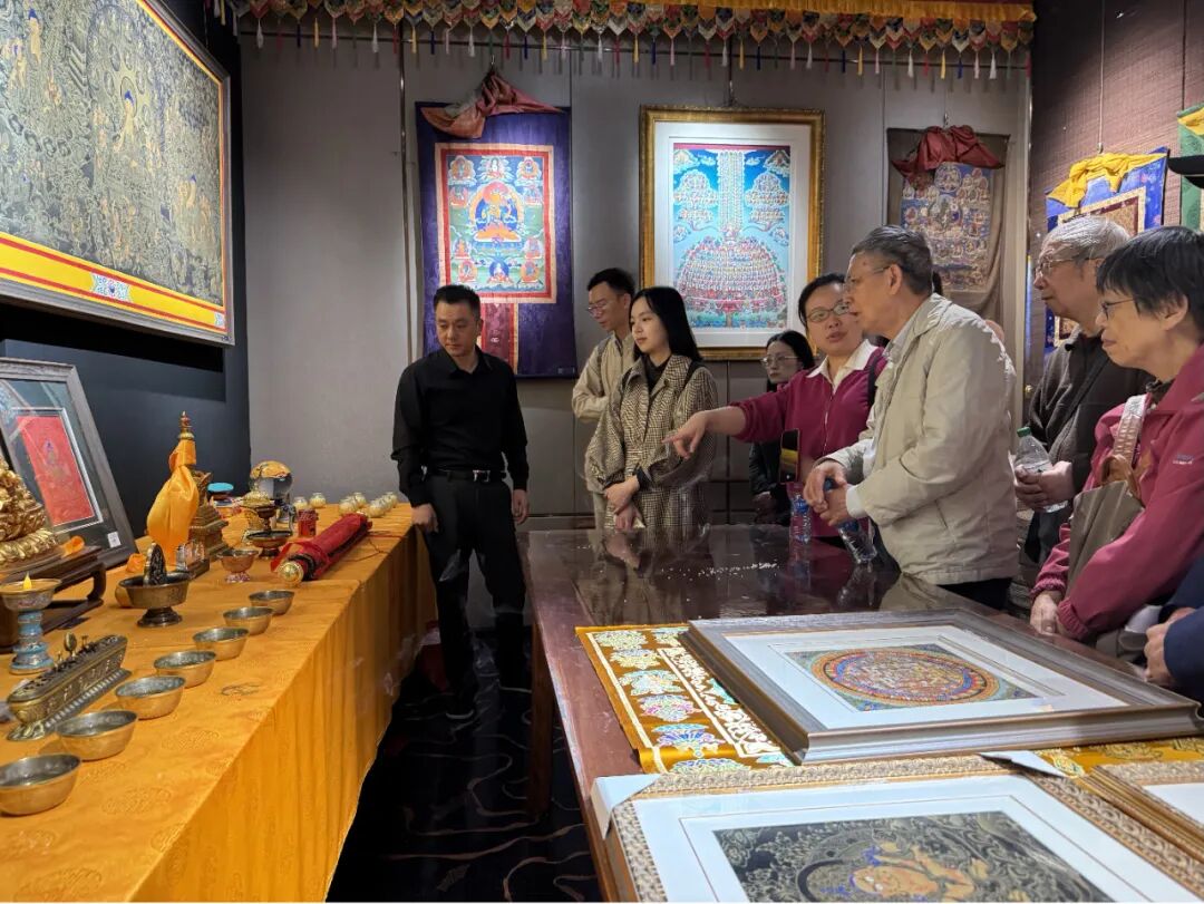 在上海中心第37层,与会党员同志在非遗传承人指导下,近距离观赏以“红色精神”为主题的唐卡作品展,感受千年非遗技艺与现代党建叙事的巧妙融合。