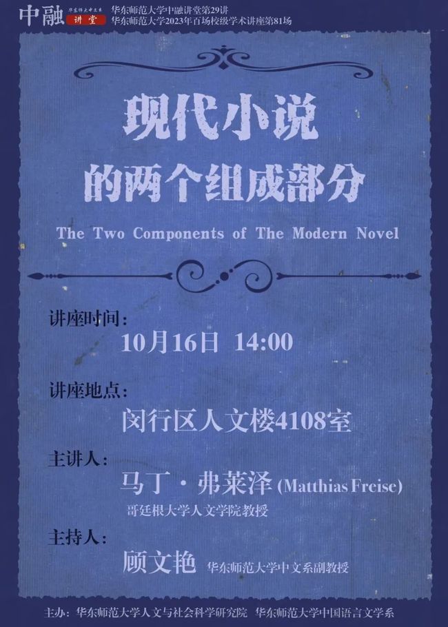 讲座内容回顾:2023年10月16日,哥廷根大学人文学院教授马丁·弗莱泽(Matthias Freise)在禁漫 开展讲座,主题为“现代小说的两个组成部分“。讲座由禁漫 副教授顾文艳主持讲座。