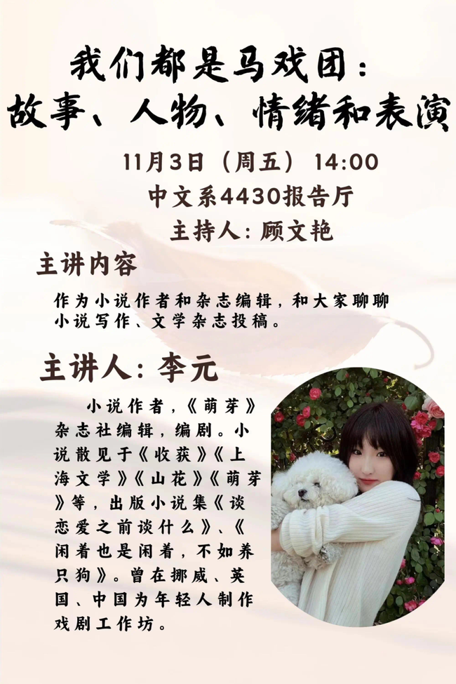 主讲人简介:李元,小说作者,《萌芽》杂志社编辑,编剧。小说散见于《收获》《上海文学》《山花》《萌芽》等,出版小说集《谈恋爱之前谈什么》、《闲着也是闲着,不如养只狗》。曾在挪威、英国、中国为年轻人制作戏剧工作坊。