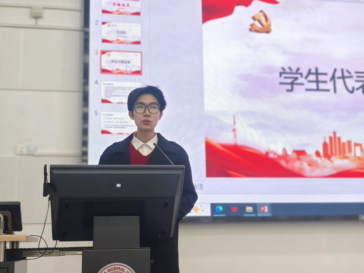 中国语言文学系2024级入党积极分子王子豪同学作为学员代表发言。他首先分享了自己的社会实践经历,表示作为一名入党积极分子,要不忘入党初心,将个人理想融入民族复兴的伟大进程,将学术追求与国家需要紧密结合;要坚持严谨治学,在学深悟透上下功夫,在融会贯通中见成效;要做到知行合一,在一点一滴的实践中提升本领,在日复一日的坚持中锤炼品格。他表示,要珍惜培训学习与理论实践机会,认真完成各项学习任务,主动参与各项实践活动,以点滴进步靠拢先进榜样,以实际行动诠释入党初心。