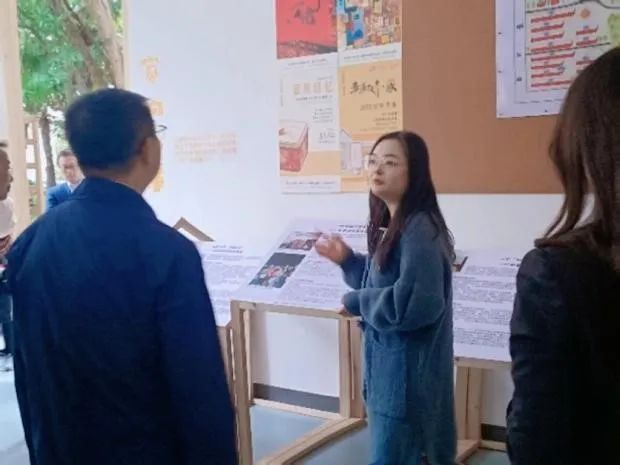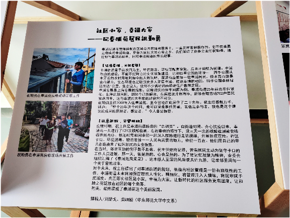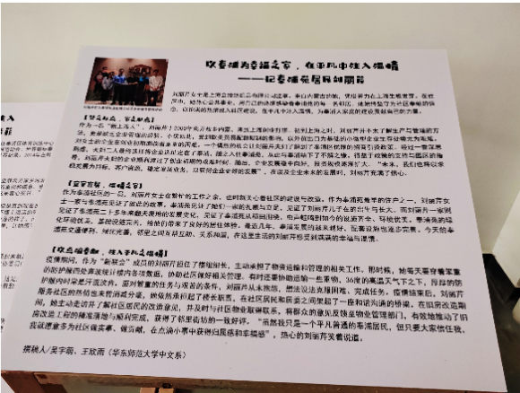 在主题展现场,华东师大禁漫 本科生党支部副书记胡王璐同志向各位领导和居民们,介绍了禁漫 党支部参与奉浦苑“社区博物馆”项目的情况: