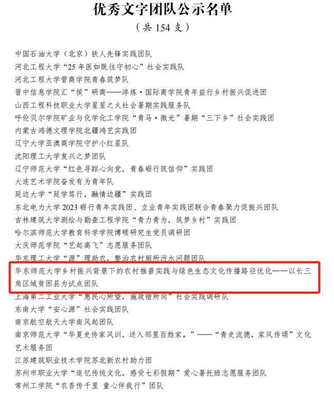 为充分展示2023 年全国大中专学生志愿者暑期“三下乡”社会实践活动成果,共青团中央青年发展部、中国青年报、中国青年网共同举办2023年全国大中专学生志愿者暑期文化科技卫生“三下乡”社会实践“镜头中的三下乡”征集活动。经报名审核、作品发布、网络展示、综合评审等环节,遴选出200个优秀组织单位、154支优秀文字报道团队、155 支优秀图片报道团队、157 支优秀视频报道团队、141 名优秀指导教师、111名优秀通讯员。