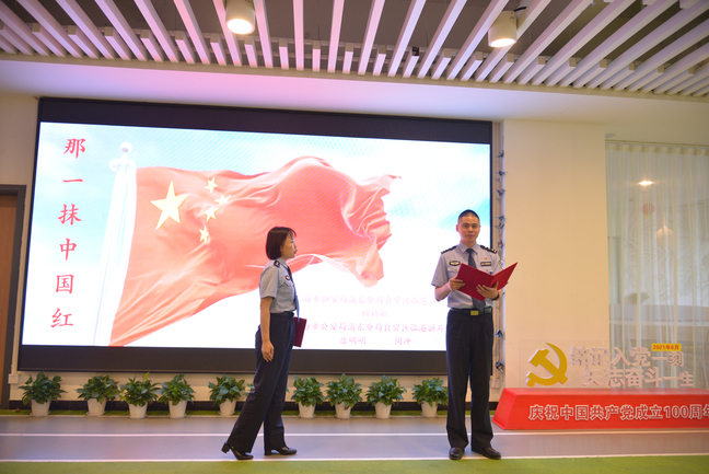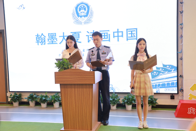 由上海市公安局文化保卫分局带来的《共产党宣言》中德双语朗诵拉开本次活动的帷幕。百年风雨苍黄,理想照耀中国。百年间,中国共产党带领全国人民前仆后继、艰苦奋斗,红色诗词是这一时期的精神象征与思想结晶:“书生意气,挥斥方遒”的少年风华,“钟山风雨起苍黄,百万雄师过大江”的豪迈气概,“俱往矣,数风流人物,还看今朝”的辽阔胸怀。两位朗诵者情感真挚,节奏昂扬,表达了革命先烈们栉风沐雨,历经沧桑志向不改的崇高精神。接着,我校禁漫 、党委组织部师生与公安民警还先后朗诵了《中国没有辜负社会主义》(节选)、《祖国啊,我亲爱的祖国》等,红色诗词穿越战火,历经风吹雨打,昭示着共产党员不改初心的意志和决心,滋养着一代又一代人民群众的精神园地,也浸润了在场师生的心田。
