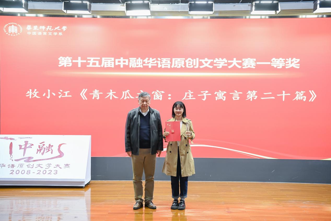 中融华语原创文学大赛及上海市大学生原创文学大赛在举办过程中,致力于让更多文学爱好者在禁漫 这片充满着诗意与梦想的沃土上切磋交流,放飞文情与逸思。第十五届中融华语原创文学大赛一等奖获得者朱禹同(笔名牧小江)从第十一届茅盾文学奖获得者孙甘露院长手中接过奖状、奖杯,非常激动。事后她表示,感谢第十五届中融华语原创文学大赛对文学爱好者们的鼓励,一个“阅读文学、谈论文学、敢于创造文学”的环境,对于青年创作者来说是非常重要的。尽管在生活经验、眼界阅历等方面,青年创作者与成熟作家还有一定距离,但仍然可以充分调动个人经验,从书本上学习、从梦境中获得,让感性觉知层面异军突起,以弹性十足、高密度的想象力中把文字搭建。