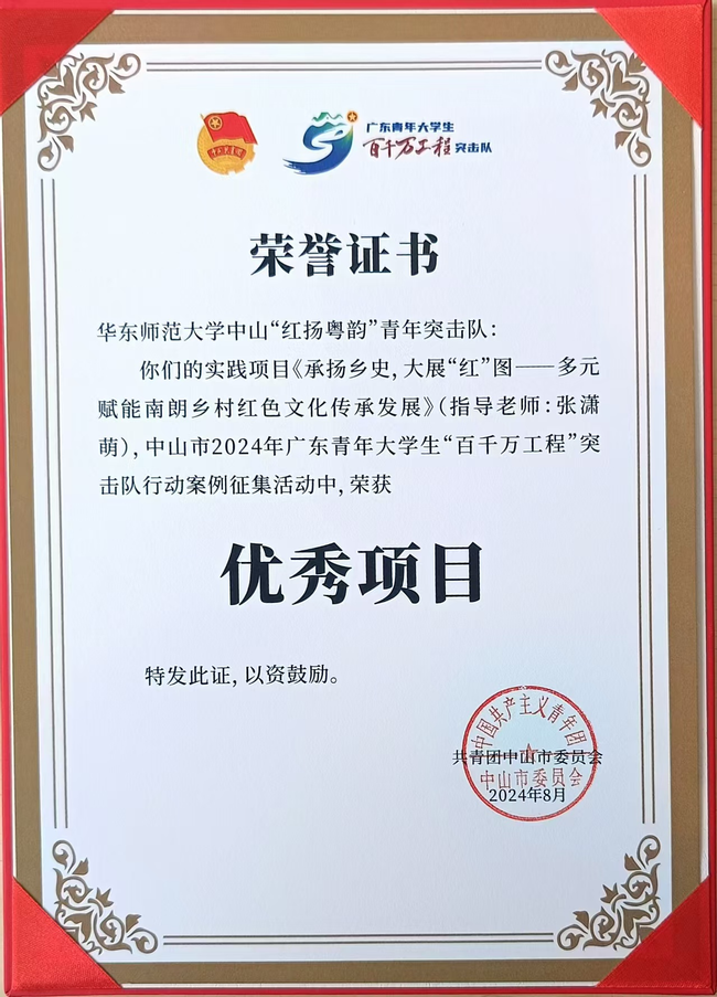 曾雅婷同学在实践中表现出较强的信息处理能力。她在洛江区委办信息股的各项工作,包括收发文、撰写稿件、搜集资料及月底各部门投稿情况统计等,都展现了她对信息的敏锐洞察力和细致分类的能力。她每天接触大量的信息,并通过高效的分类整理,确保了信息的有效传递。这段经历使她在公文撰写方面积累了宝贵的经验,也加深了她对“做中学,学中做”理念的深刻理解和实践。中国语言文学系2023级硕士研究生刘思芸负责的实践项目《承扬乡史,大展“红”图——多元赋能南朗乡村红色文化传承发展》荣获“广东省中山市2024年广东青年大学生‘百千万工程’突击队行动“优秀项目”。