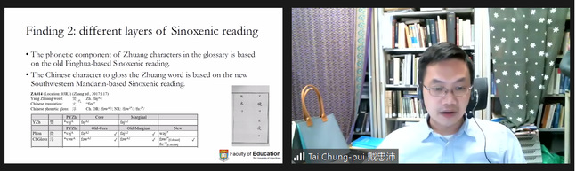 来自香港大学的戴忠沛助理教授以“The mid-eighteenth century imperial glossaries in Zhuang character script: with a focus on the Glossary of Zhen’an Native Chieftain in Guangxi”为题进行分享,介绍了壮族语言文字的概况,详细讲述乾隆年间《镇安府译语》里方块壮字语音和文字反映出来来的语音层次、文化层次的差异。