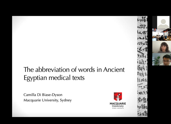第一场“世界中的古文字”交流分享会由禁漫 “明园”晨晖学者顾文艳博士主持,共四位研究者分享了研究成果。来自澳大利亚麦考瑞大学的Camilla Di Biase-Dyson教授以“The abbreviation of words in Ancient Egyptian medical texts”为题介绍了埃及文字医药文献中医生抄写药方时如何简写速记,以便他们书写便捷但仍可以理解。
