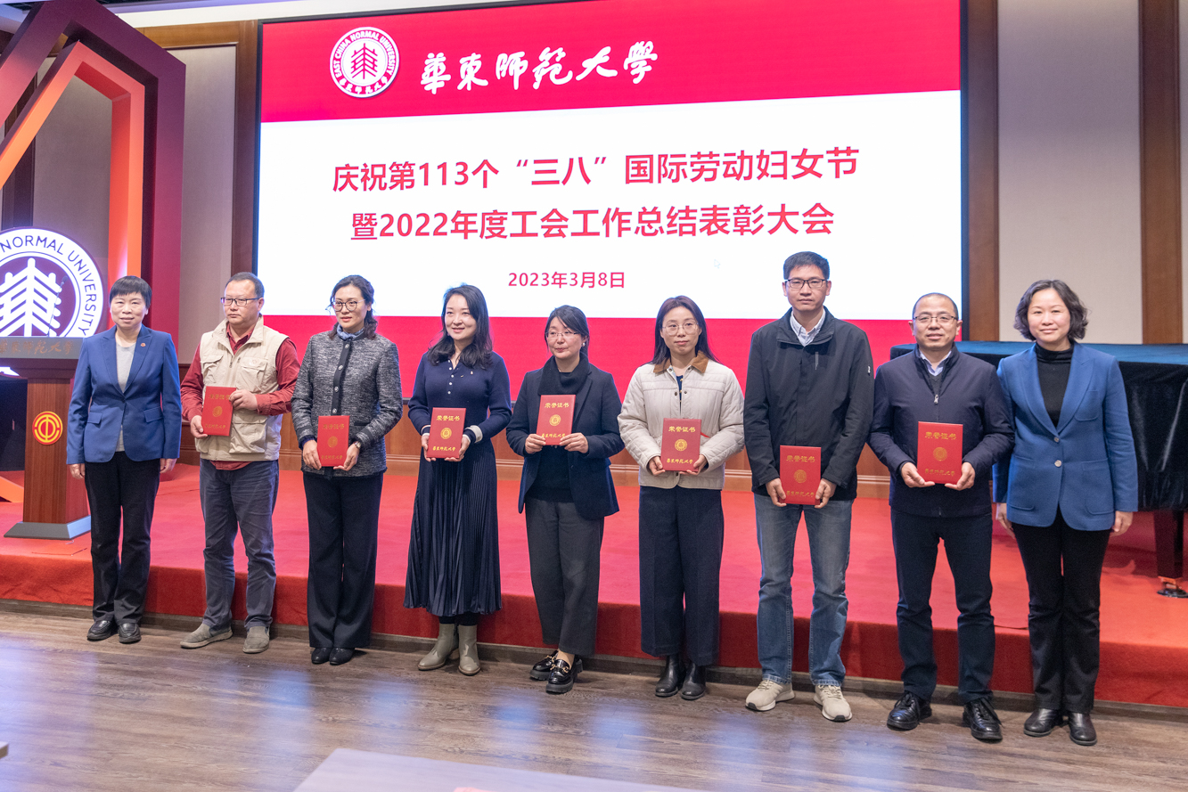 3月8日上午,华东师大庆祝第113个“三八”国际劳动妇女节暨2022年度工会工作总结表彰大会在普陀校区工会一楼多功能厅举行。校工会两委委员,妇委会委员、各部门工会主席以及获得各类荣誉称号的先进个人和先进集体代表70余人参加了表彰会。校领导杨昌利、程静出席会议,并为获奖个人和单位颁奖。
