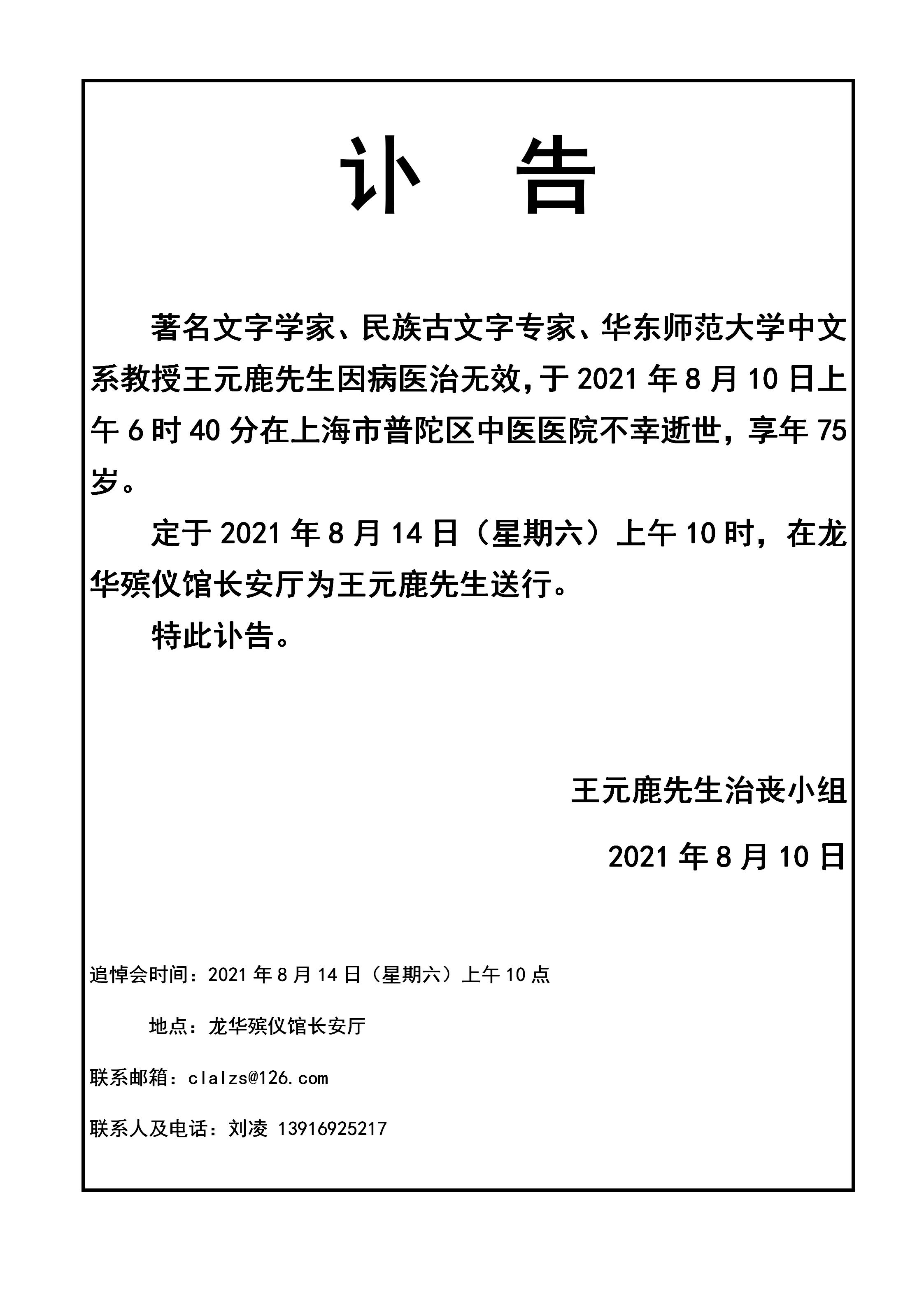 2021年8月14日,王元鹿先生追悼会于龙华殡仪馆举行。追悼会由华东师大禁漫 终身教授刘志基主持,禁漫 党委书记吕志峰致悼词,上海外国语大学国际文化交流学院副院长朱建军作为学生代表发言,最后家属代表王茵老师追忆王先生生前往事并致谢辞。王元鹿先生去世以来收到了很多唁电与挽联,此处选取其中部分内容,以寄托哀思,共同怀念先生。王元鹿先生千古!