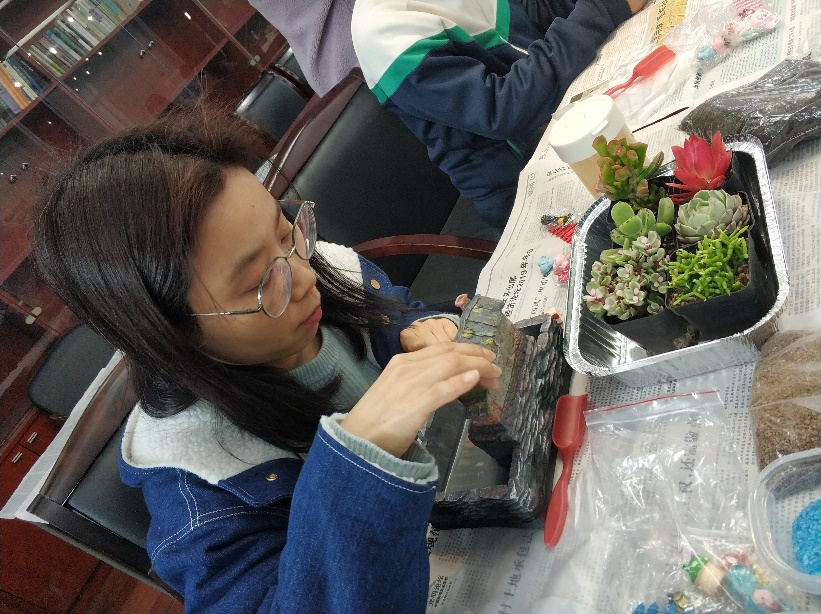 活动开始,彭老师从多肉植物的常见种类、栽培养护知识、造型等方面为大家作了详细介绍,并展示了已经完工的成品。面对桌上琳琅满目的多肉植物,大家摩拳擦掌、迫不及待地动手设计属于自己的多肉景观,将雅乐之舞、吸财树、本巴迪斯、熊童子、稻草人和火炬等多种多肉植物移植到景观盆里,通过自己的创意,加上各式小摆件,使多肉植物景观变得和谐精致。