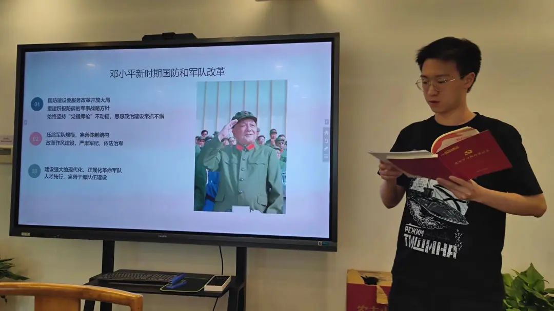 吕宁小组分享的书目是《邓小平时代》,并将主题聚焦在改革开放前的邓小平。作为决定当代中国前途命运的关键一招,改革开放的伟大转折有着深刻而复杂的国内外背景。小组从当时国际冷战格局入手,探讨了我国当时面临的来自苏联和越南的威胁以及它对外交政策产生的重要影响,也谈到我国向日本开放的重要意义。复杂多变的国际局势对军队的战斗力提出了更高的要求,小组还从解放战争时期开始,追溯了邓小平的强军思想,并从中领悟出强国必先强军的深刻道理。