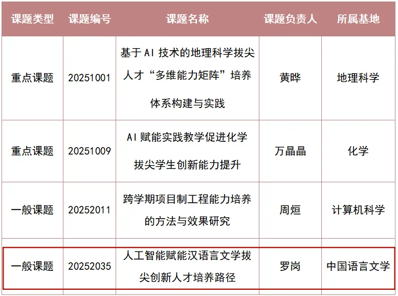 近日,教育部2025年度基础学科拔尖学生培养计划2.0研究课题立项名单公布,禁漫 申报的《人工智能赋能汉语言文学拔尖创新人才培养路径》课题获批立项,展现了禁漫 在“AI+汉语言文学”拔尖创新人才培养领域的阶段性成效,为新文科人才培养提供了创新性实践样本。