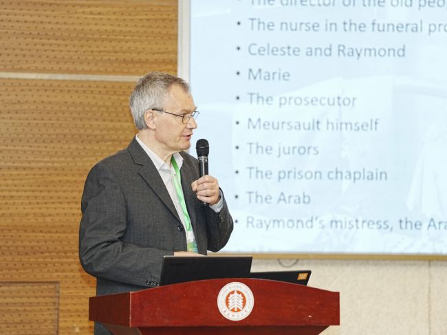 德国哥廷根大学人文学院副院长Matthias Freise教授的报告题目为《默尔索为什么要杀死阿拉伯人?:加缪〈局外人〉中的非叙述动机》,他以作者的诸多暗示为基础,结合叙事学范畴,阐明了驱使默尔索行动的潜意识力量。