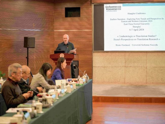 上午第二场议题“语言、叙事、翻译”由禁漫 吴攸教授主持。法国新索邦大学Bruno Poncharal教授以《翻译学还是翻译研究?翻译研究的法国视角》为题,考察了“翻译学(traductologie)”在法国学术话语中的出现和发展,将其与公认的术语“翻译研究(Translation)”进行对比,强调了安托万·贝尔曼、亨利·梅什孔尼克等理论家对法国翻译学的塑造影响,同时反思了人工智能时代翻译所面临的挑战。