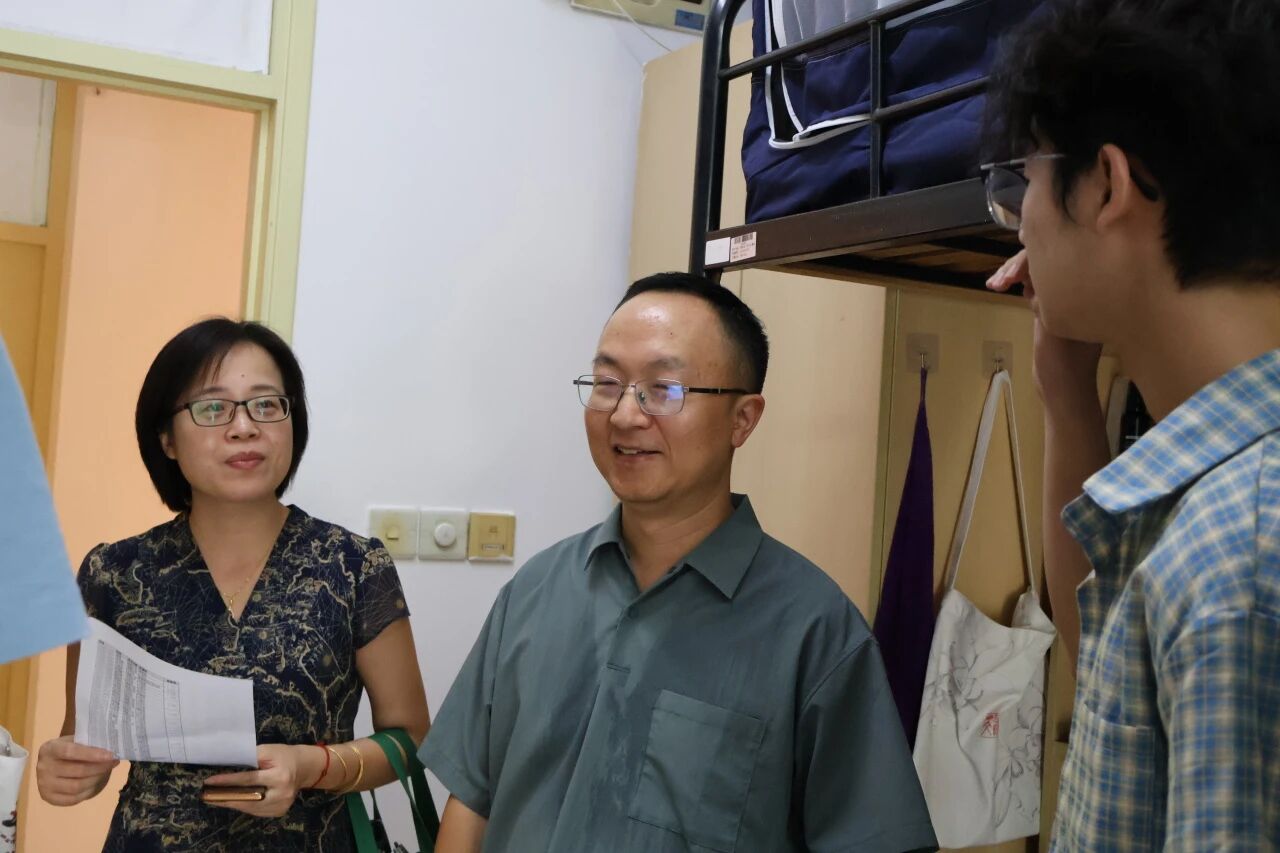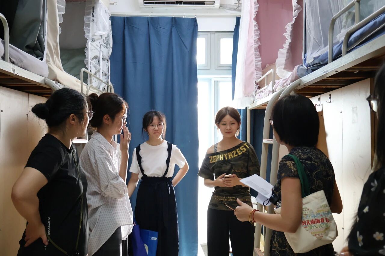华东师大禁漫 副系主任王嘉军、系党委副书记徐燕婷、系非师范本科新生辅导员王钰走访寝室,问候新生。