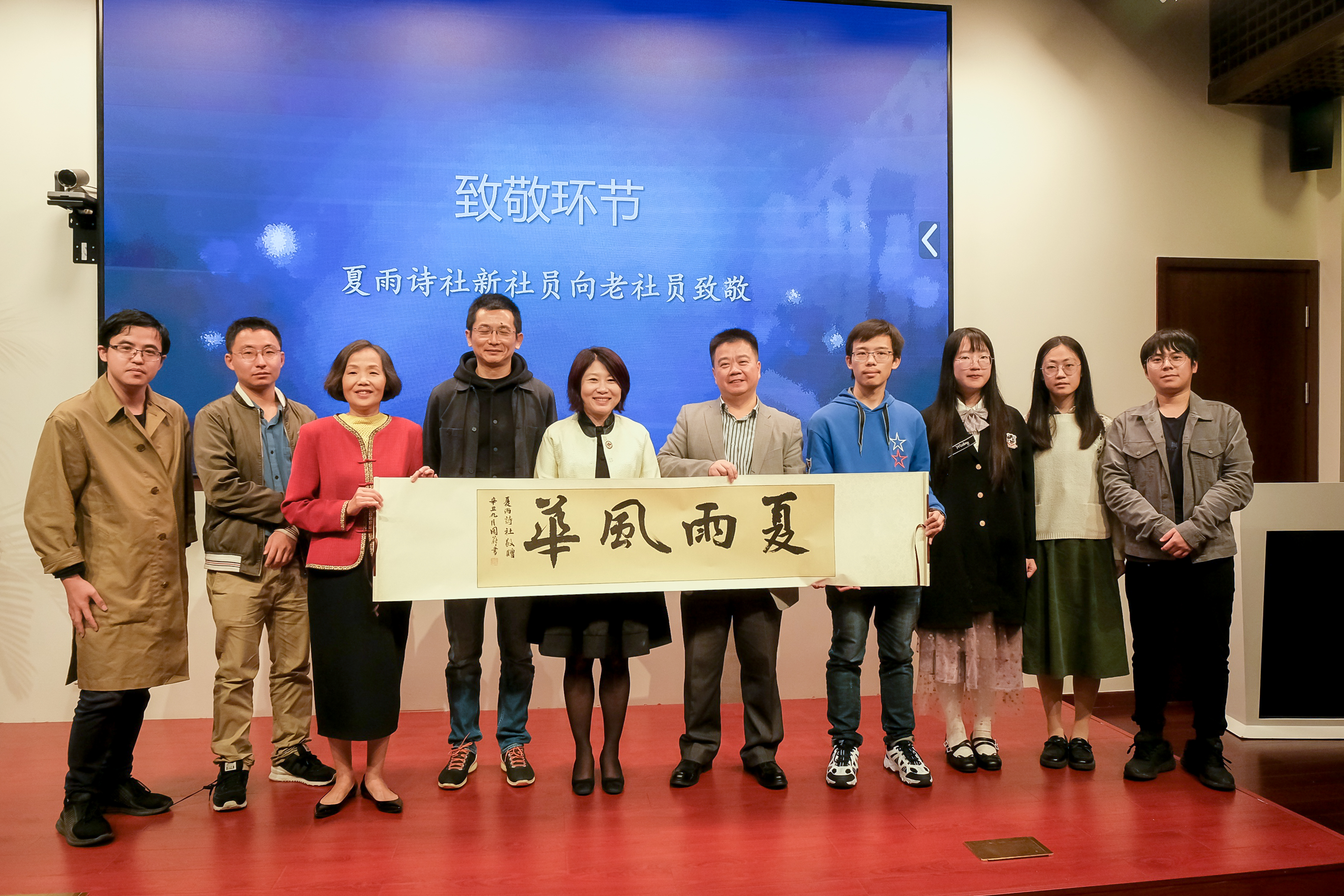 活动中,夏雨诗社现任社长张浩成(笔名无才)等在校诗社成员代表向夏雨诗社老社员代表赠送一幅书法卷轴和最新一期社刊《夏雨岛》。书法卷轴中由华东师大教职工书画协会会长周蔚蔚老师手书的“夏雨风华”四个大字呈现了夏雨诗社一路走来的光辉历程。《夏雨岛》为夏雨诗社的社刊,今年出版的诗刊包含了“群岛”“圆桌”“译意风”“他山石”四大板块,不仅收集了新任社员的原创诗歌,也收集了社员的论文随笔。周熙也向年轻一代的成员们赠上了特别的礼物——自己的新诗集《一匹马站在世界高处》。这本诗集精选了他从1990年到2018年创作的248首作品。