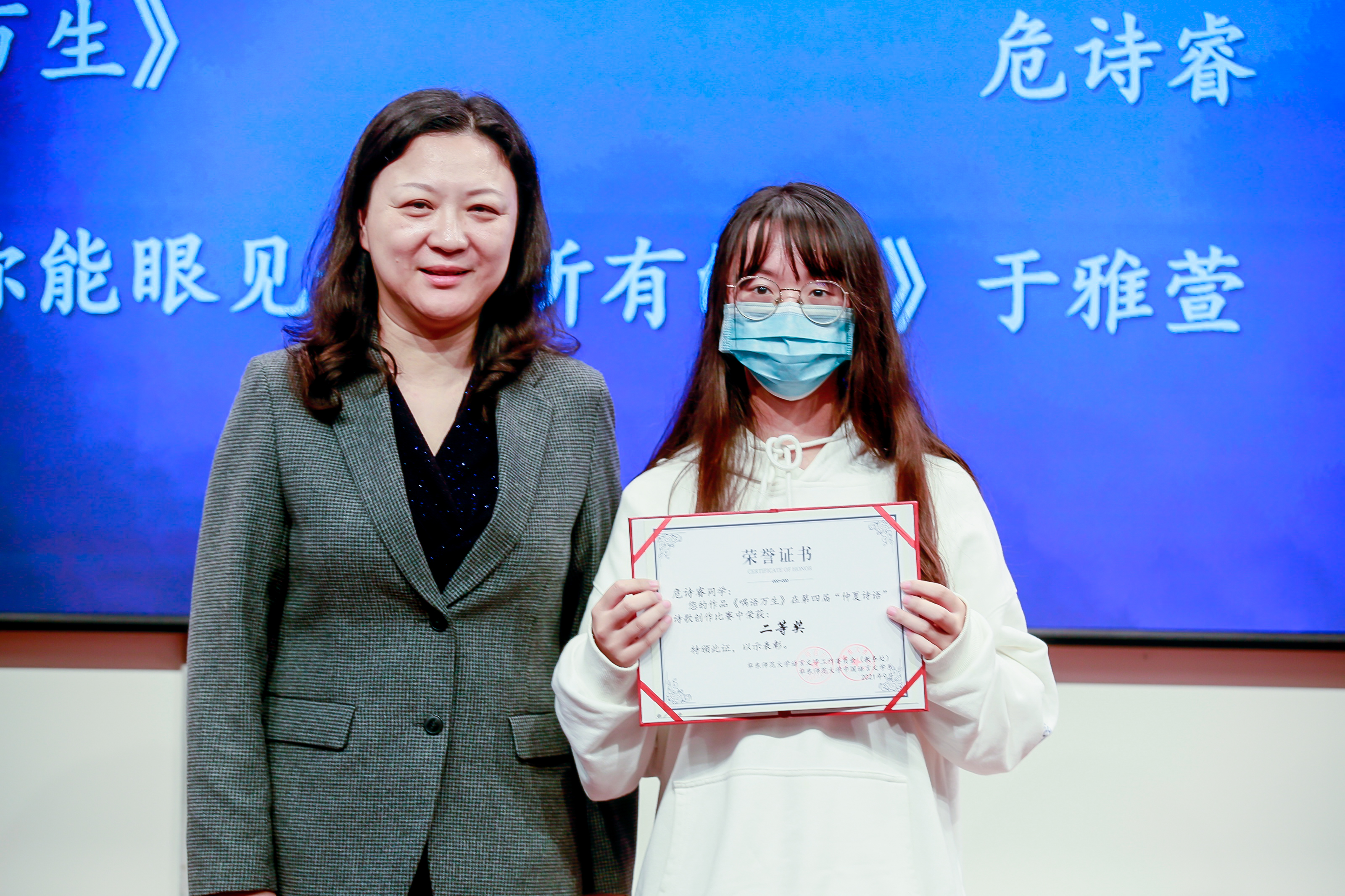 第四届“仲夏诗语”诗歌创作比赛颁奖典礼在活动上举行。华东师大校长助理、校友工作办公室主任斯阳等为获奖者颁奖。华东师大与上海市民诗歌节结缘始于数年前,通过“仲夏诗语”诗歌创作大赛为上海市民诗歌节推荐优秀参赛作品,该赛事至今已举办四届。今年的诗歌创作比赛以“奋斗百年路 启航新征程”为主题,旨在以诗歌献礼党的百年生日,书写建党百年波澜壮阔的宏伟画卷,谱写中华民族伟大复兴的澎湃史诗。优秀作品已被推荐参加第七届上海市民诗歌节活动。
