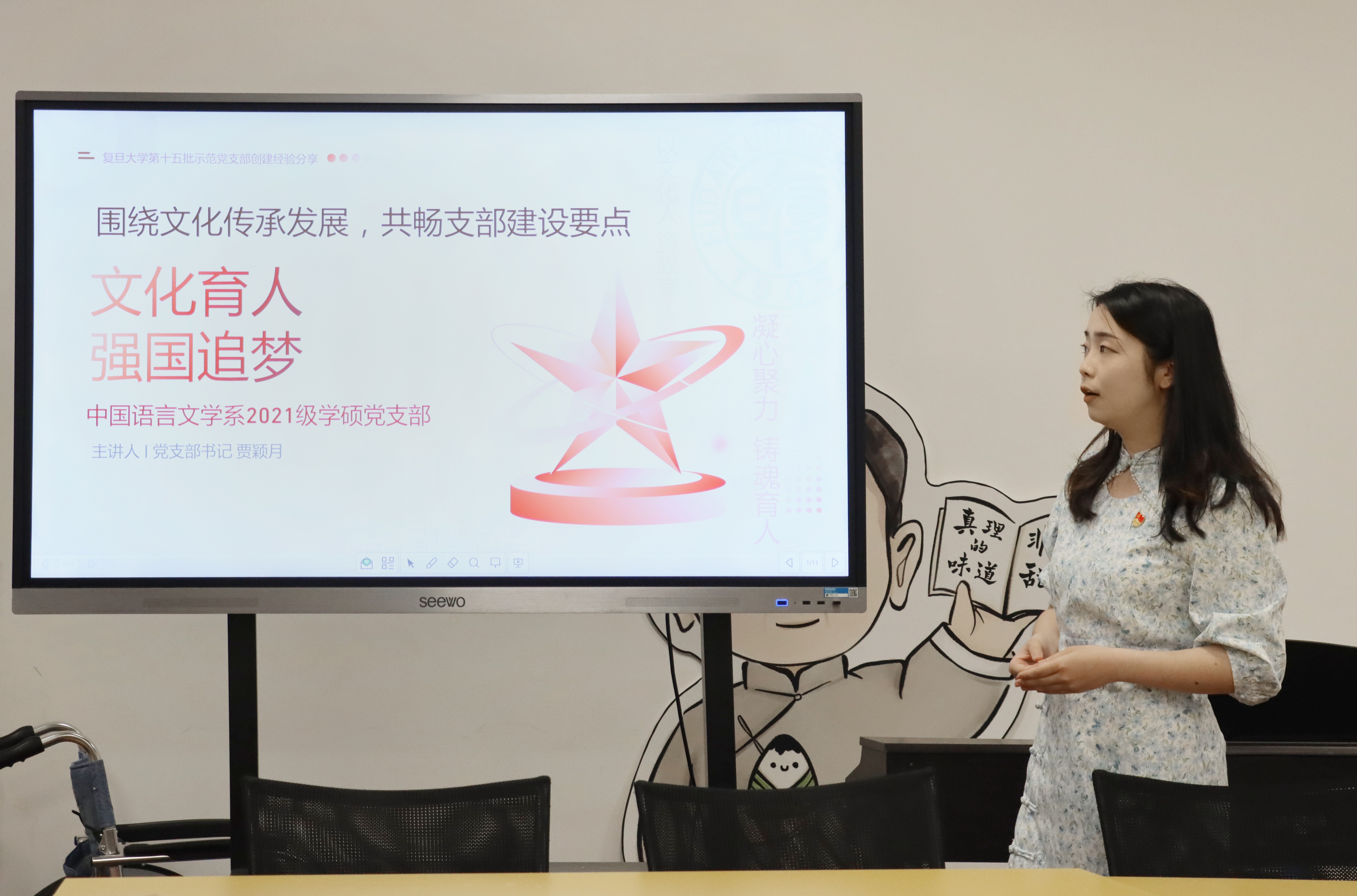 复旦大学禁漫 2021级学硕党支部书记贾颖月介绍了其所在支部创建复旦大学第十五批示范党支部的主要成果,在抓住专业的特色、利用学校资源、以赛促建、跨校跨专业共建和采用多种形式推动党建工作、建设服务型党支部等方面提供了可资借鉴的宝贵经验。