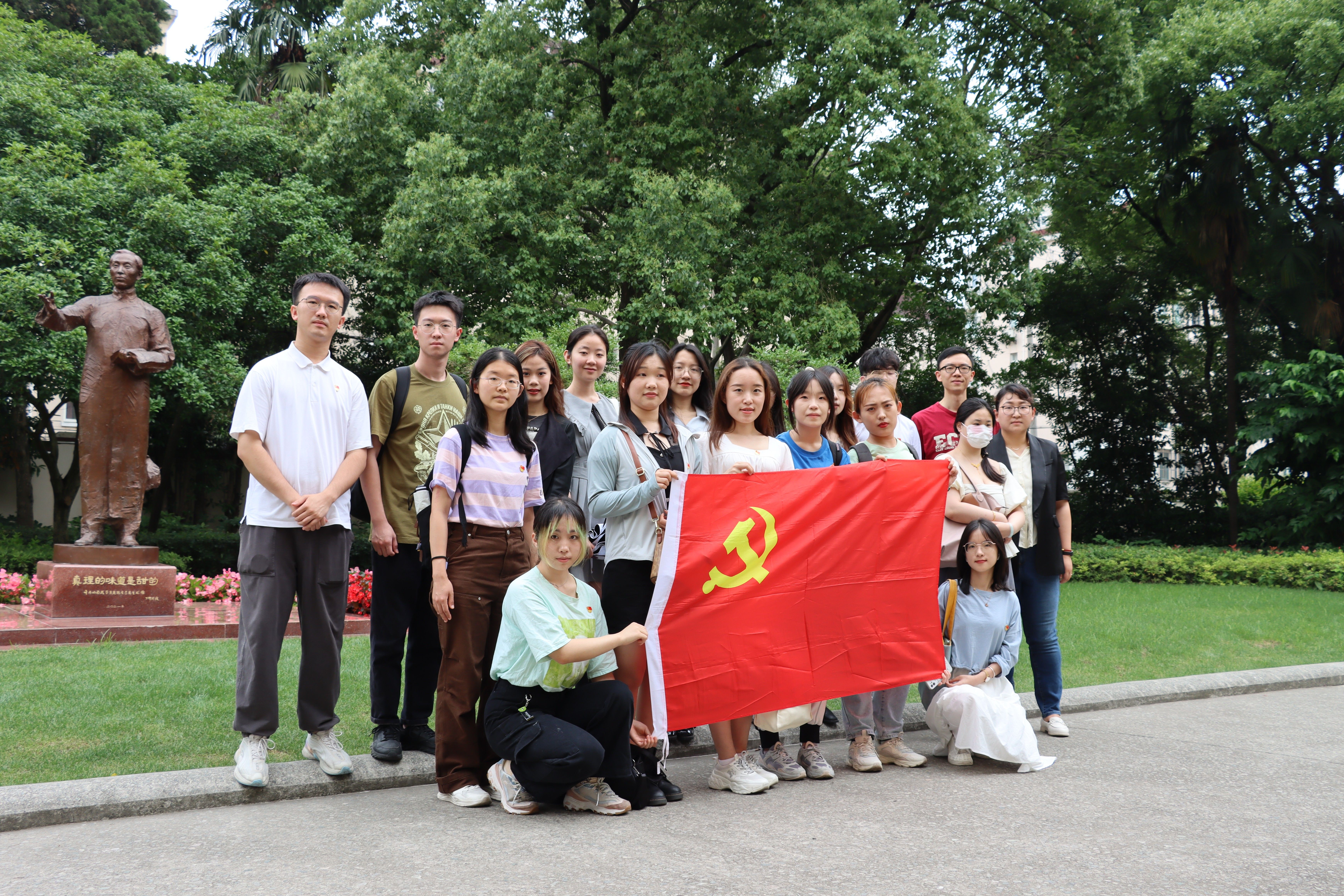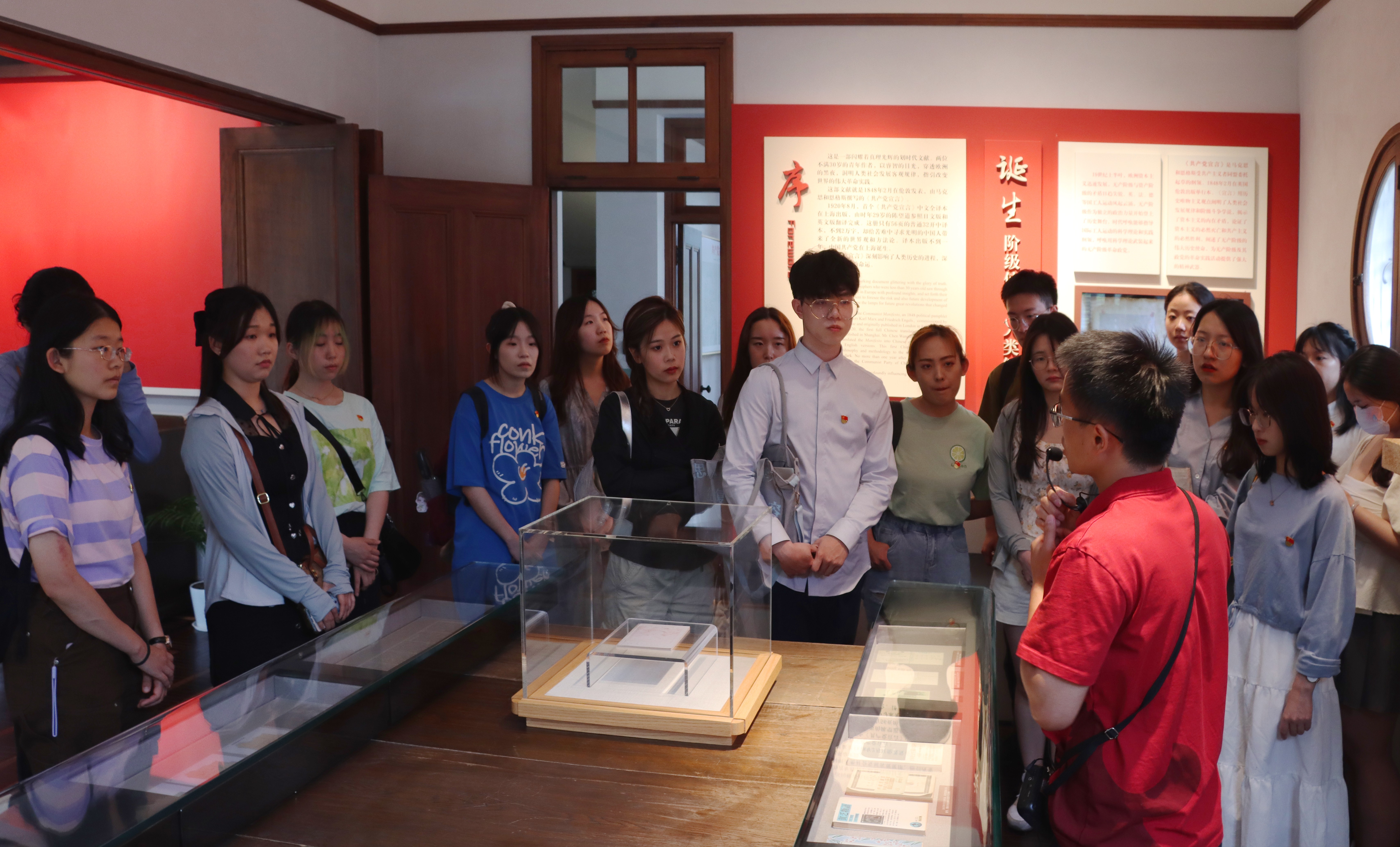 复旦大学是《共产党宣言》中文全译本首译者陈望道先生工作过的地方,有着深远的红色传统与丰富的红色文化资源。本次联学共建的第一站,禁漫 本科生党支部来到位于国福路51号的《共产党宣言》展示馆参观学习,在《共产党宣言》中译本诞生的故事中守望初心使命。在复旦大学《共产党宣言》展示馆党员志愿服务队队员、复旦大学禁漫 学硕第一党支部书记罗炜的讲解中,本科生党支部全体同志重返历史现场,深入了解了《共产党宣言》诞生前后严峻的社会形势,真切领悟了陈望道先生翻译《共产党宣言》对中国革命产生的重要影响,并为陈望道先生“真理的味道非常甜”的故事和他矢志不渝追求真理的精神所感动。
