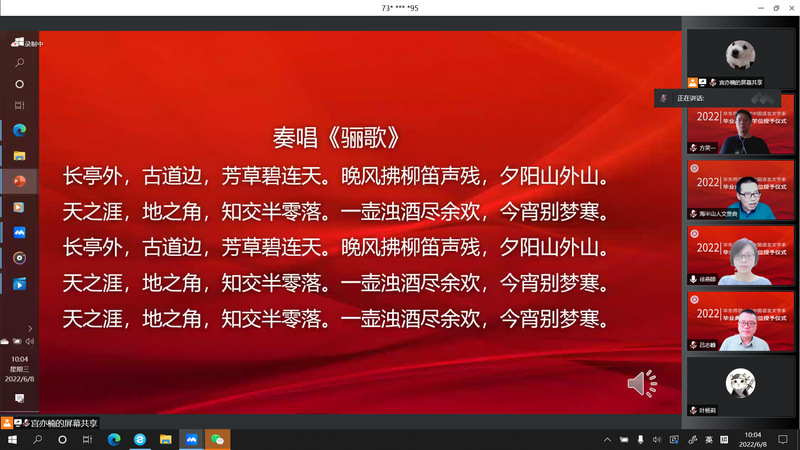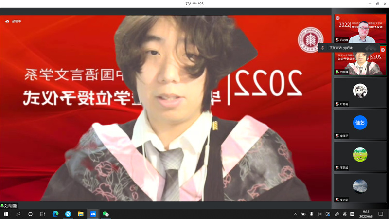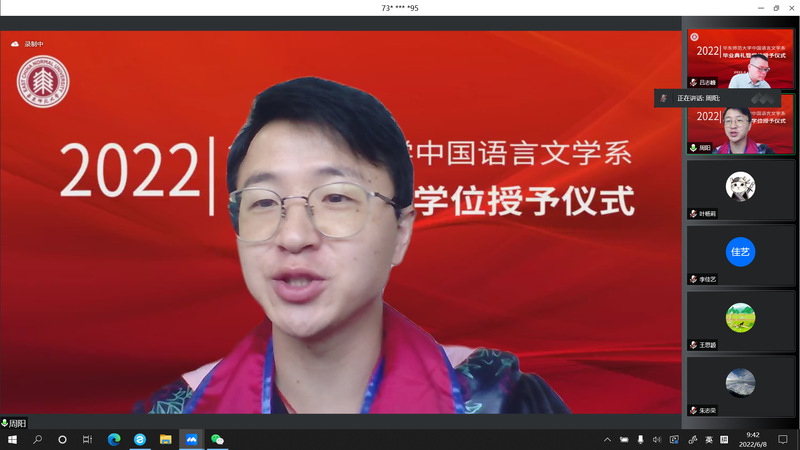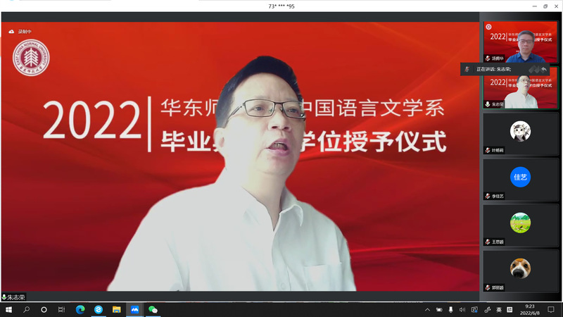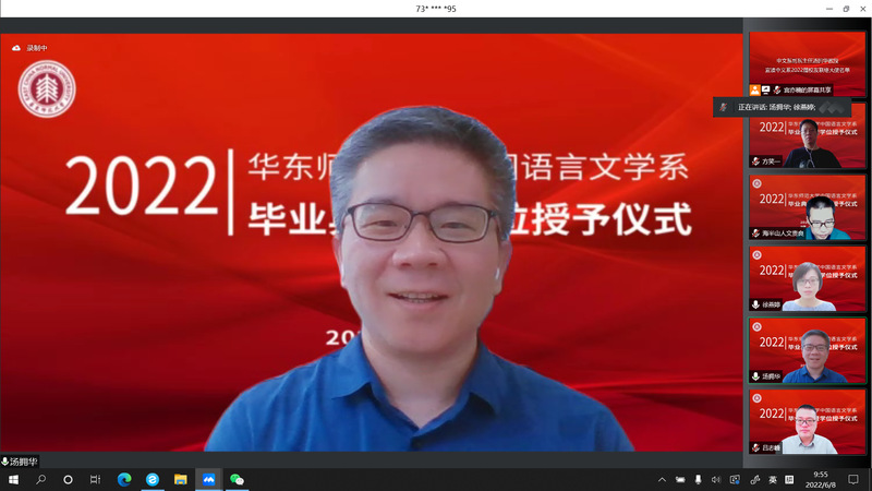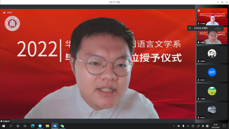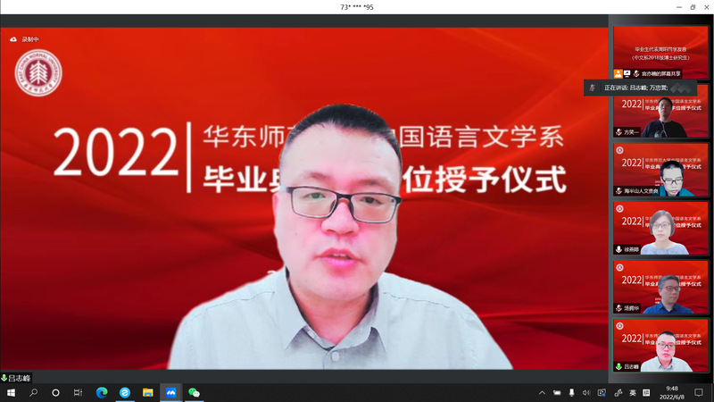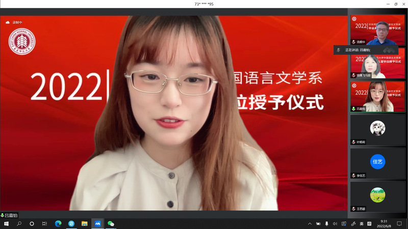 2022年6月8日,禁漫 中国语言文学系2022届毕业典礼暨学位授予仪式于周三上午9点顺利举行。因疫情防控工作需要,禁漫 采取线上方式,为2022届毕业生精心策划了一场别样的“云毕业典礼”。本次典礼由禁漫 党委副书记徐燕婷副教授主持。